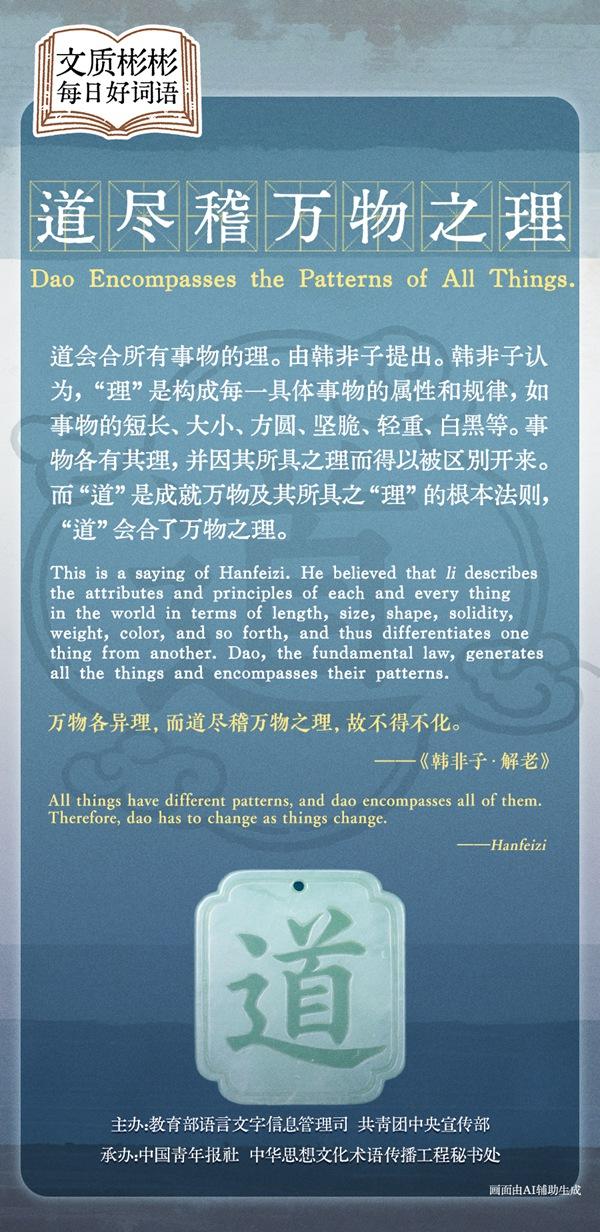 This is a saying of Hanfeizi. He believed that li describes the attributes and principles of each and every thing in the world in terms of length, size, shape, solidity, weight, color, and so forth, and thus differentiates one thing from another. Dao, the fundamental law, generates all the things and encompasses their patterns.