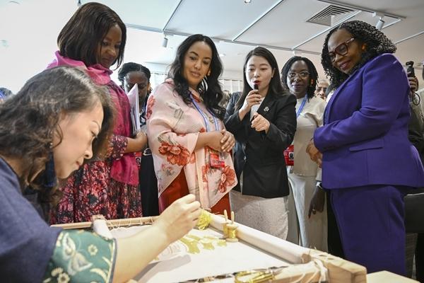 10月14日,全球妇女峰会参会嘉宾在北京市秀水街大厦参访。这是嘉宾在了解京绣。新华社记者 邹竞一/摄