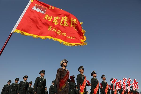 阅兵式上,“刘老庄连”荣誉旗帜在战旗方队里迎风飘扬,无声地诉说着这支英雄连队浴血荣光的历史。1943年3月18日,为掩护淮海区党政机关和人民群众安全转移,新四军第三师七旅十九团四连82名官兵在江苏淮阴刘老庄与千余名日伪军展开殊死拼杀,终因寡不敌众全部壮烈牺牲。战后,当地群众选送82名优秀青年参军,新四军第三师七旅重新组建连队并命名为“刘老庄连”。