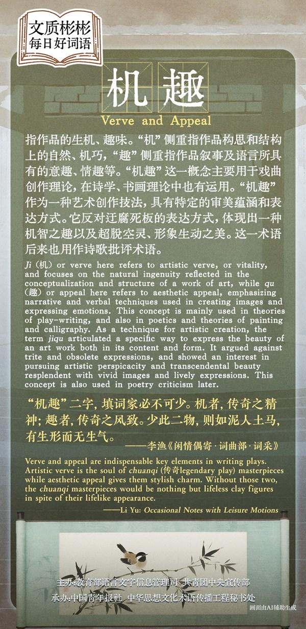 Ji or verve here refers to artistic verve, or vitality, and focuses on the natural ingenuity reflected in the conceptualization and structure of a work of art, while qu or appeal here refers to aesthetic appeal, emphasizing narrative and verbal techniques used in creating images and expressing emotions. This concept is mainly used in theories of play-writing, and also in poetics and theories of painting and calligraphy. As a technique for artistic creation, the term jiqu articulated a specific way to express the beauty of an art work both in its content and form. It argued against trite and obsolete expressions, and showed an interest in pursuing artistic perspicacity and transcendental beauty resplendent with vivid images and lively expressions. This concept is also used in poetry criticism later.