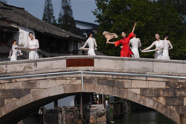 10月24日,表演者在新市古镇万象桥表演民间舞。 10月24日,为期5天的第二季新市古镇舞蹈艺术季在浙江省德清县新市古镇开幕。开幕式环境舞蹈展演环节,演员们在江南古镇的原生态“舞台”中移步换景,串联表演诸多舞蹈节目,为观众呈现独特的艺术享受。新华社记者 黄宗治/摄