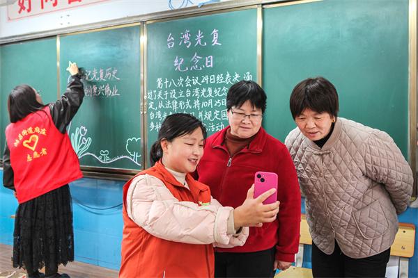 10月25日,河南焦作,志愿者在博爱县鸿昌街道麻庄村新时代文明实践站向村民宣传。当天是台湾光复纪念日,该村组织志愿者在新时代文明实践站开展宣传活动。视觉中国供图