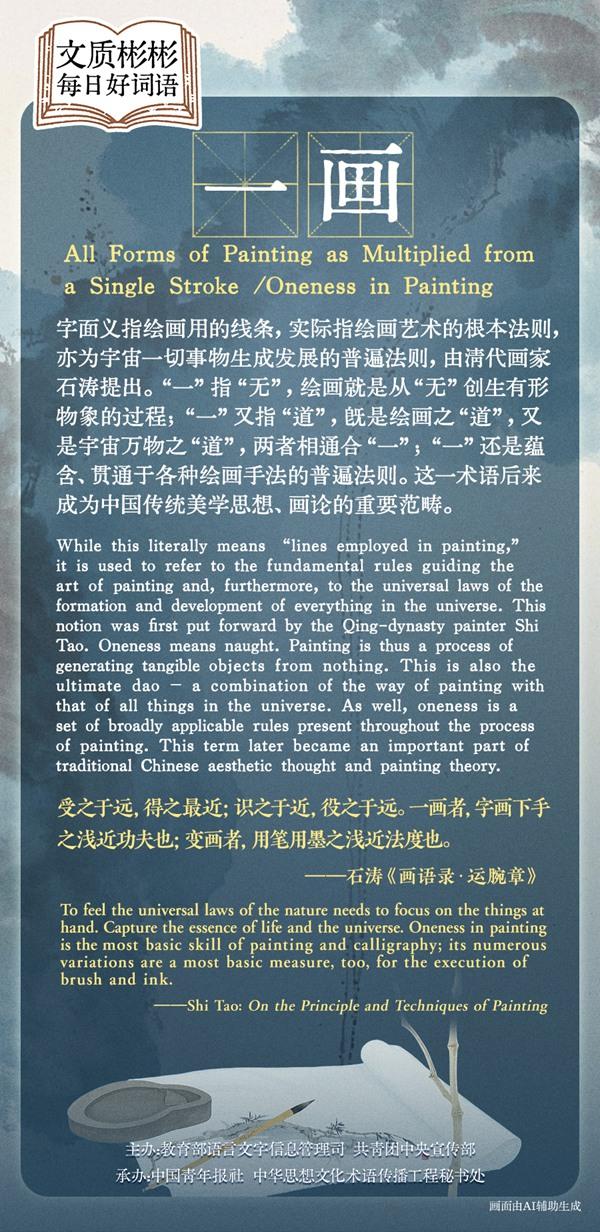 字面义指绘画用的线条,实际指绘画艺术的根本法则,亦为宇宙一切事物生成发展的普遍法则。清代画家石涛认为,宇宙万物都生成于原始的“一”,画家笔下的有形万物,亦由“一”创生并贯之以“一”。在石涛看来,“一”指“无”,绘画就是从“无”创生有形物象的过程;“一”又指“道”,既是绘画之“道”,又是宇宙万物之“道”,两者相通合“一”。“一画论”后来成为中国传统美学思想、画论的重要组成部分。