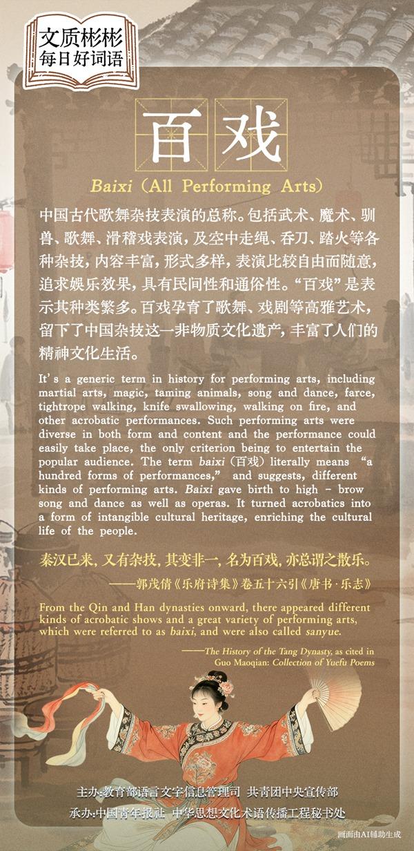It's a generic term in history for performing arts, including martial arts, magic, taming animals, song and dance, farce, tightrope walking, knife swallowing, walking on fire, and other acrobatic performances. Such performing arts were diverse in both form and content, with the only criterion being to entertain the popular audience. The term baixi literally means "a hundred forms of performances", and suggests, different kinds of performing arts. Such performances began in Han times. After the Southern and Northern Dynasties, another term sanyue became synonymous with baixi. During the Tang Dynasty the performing arts became even more popular. In Song times sanyue came to refer mainly to song and dance performances or operas created by men of letters; while baixi came to mean principally acrobatic shows by folk artists. It is fair to say that baixi gave birth to high-brow song and dance as well as operas. It turned acrobatics into a form of intangible cultural heritage.