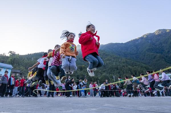 11月13日,贵州从江,刚边壮族乡中心小学学生参加集体跳长绳比赛。近年来,贵州省黔东南苗族侗族自治州从江县各中小学积极开展校园体育活动,培养学生运动兴趣,丰富校园体育文化。视觉中国供图