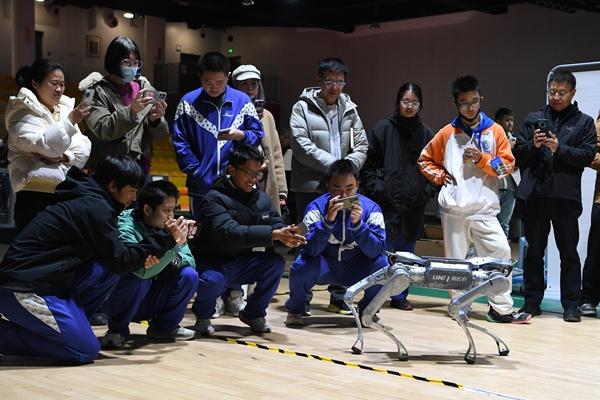 11月15日,人们在现场观看一款仿生四足机器人展示。当日,2025青少年具身智能与人形机器人科技教育研讨会暨后备科技人才培养交流会在北京市通州区举行。本次活动通过专家报告、平行论坛等形式,展示具身智能等方面的最新成果并探讨前沿科技对基础教育的新影响新要求。新华社记者 马宁/摄
