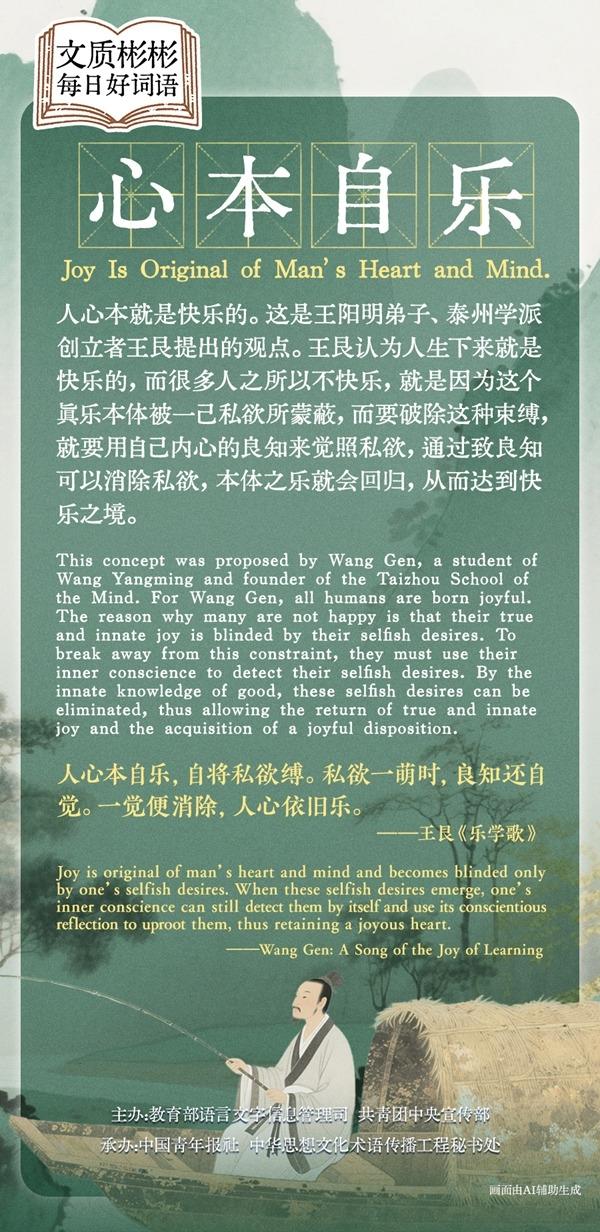 Joy is original of man's heart and mind and becomes blinded only by one's selfish desires. When these selfish desires emerge, one's inner conscience can still detect them by itself and use its conscientious reflection to uproot them, thus retaining a joyous heart. (Wang Gen: A Song of the Joy of Learning)