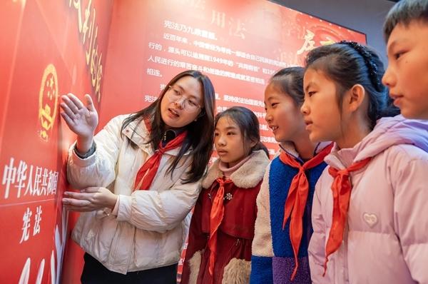 12月2日,江苏海安高新区实验小学学生在宪法教育馆听老师讲解宪法知识。当日,江苏省海安高新区实验小学组织学生来到宪法教育馆,开展“宪法伴我成长”主题教育活动,学生们通过实地参观法治展厅、听老师讲解宪法知识等形式,增强学法、知法、守法意识,弘扬宪法精神,迎接“国家宪法日”的到来。翟伟凯/视觉中国