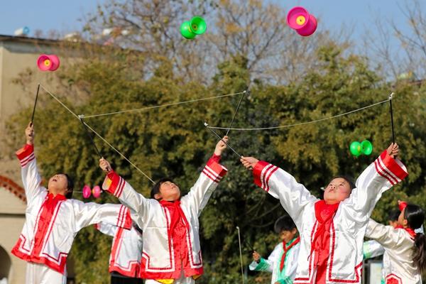 当日,相山区刘桥矿小学开展丰富多彩的阳光体育大课间活动,学生们在练习五禽戏、抖空竹、滚铁环、踢毽子等传统体育项目中,享受课间运动快乐。近年来,该校积极落实“双减”政策,将优秀传统体育引入大课间,让孩子们在运动中健康快乐成长。万善朝/视觉中国