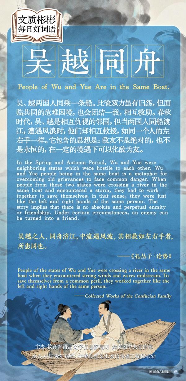 吴、越两国人同乘一条船。比喻双方虽有旧怨,但面临共同的危难困境,也会团结一致,相互救助。春秋时代,吴、越是相互仇视的邻国,但当两国人同船渡江、遭遇风浪时,他们却相互救援,如同一个人的左右手一样。它包含的思想是:敌友不是绝对的,也不是永恒的,在一定的境遇下可以化敌为友。