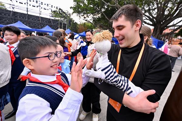 12月12日,参加泉州国际木偶展演活动的俄罗斯青年与小朋友互动。