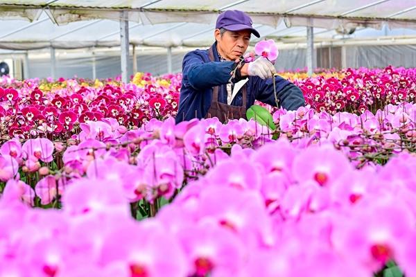 12月27日,江苏省昆山市张浦镇高效农业产业园内,数万株蝴蝶兰鲜艳夺目,花农正在按照线上线下订单要求对蝴蝶兰花进行挑选。视觉中国供图