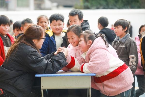 1月8日,贵州省黔西市,五里布依族苗族乡茶林小学,老师和学生课间做游戏、掰手腕。五里布依族苗族乡茶林小学2002年建成投用,设施逐渐陈旧,出现屋面漏水等问题。2025年,得益于市政协专项资金支持,教学点进行全面改善,让山里的孩子们安心读书。视觉中国供图