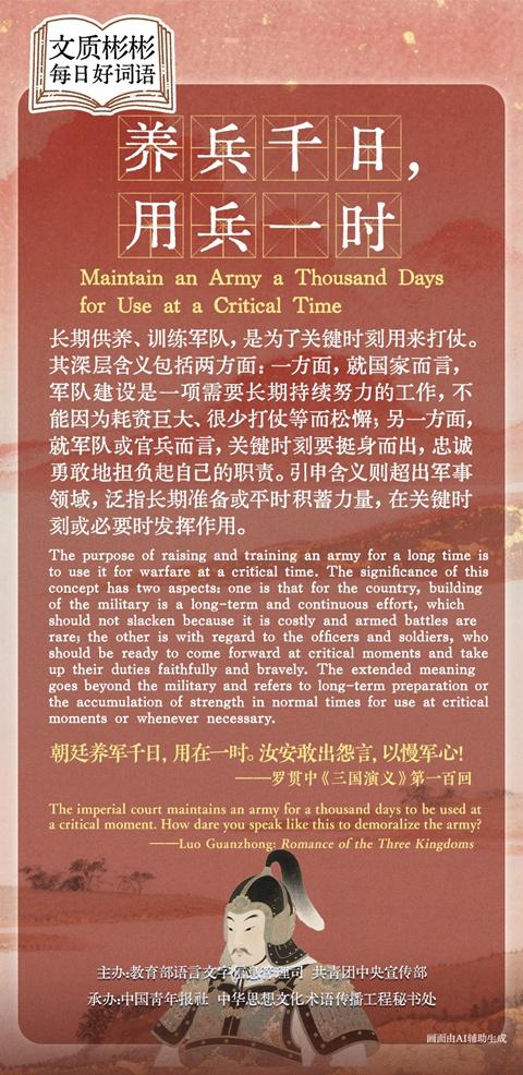 The purpose of raising and training an army for a long time is to use it for warfare at a critical time. The significance of this concept has two aspects: one is that for the country, building of the military is a long-term and continuous effort, which should not slacken because it is costly and armed battles are rare; the other is with regard to the officers and soldiers, who should be ready to come forward at critical moments and take up their duties faithfully and bravely. The extended meaning goes beyond the military and refers to long-term preparation or the accumulation of strength in normal times for use at critical moments or whenever necessary.