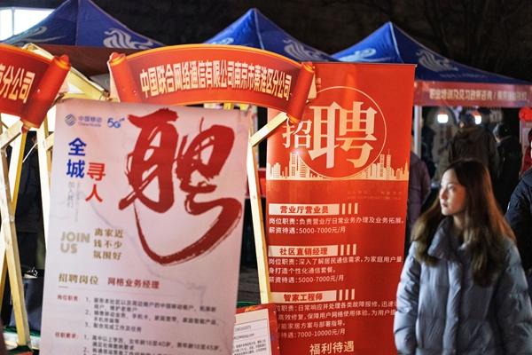 1月9日,求职者在南京老门东景区“人才夜市”上了解招聘信息。