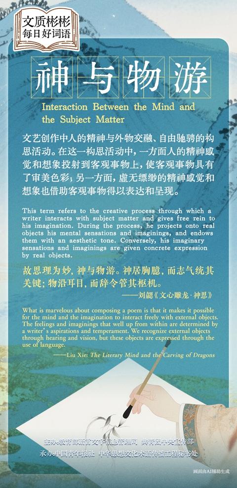 文艺创作中人的精神与外物交融、自由驰骋的构思活动。在这一构思活动中,一方面人的精神感觉和想象投射到客观事物上,使客观事物具有审美色彩;另一方面,虚无缥缈的精神感觉和想象也借助客观事物得以表达和呈现。