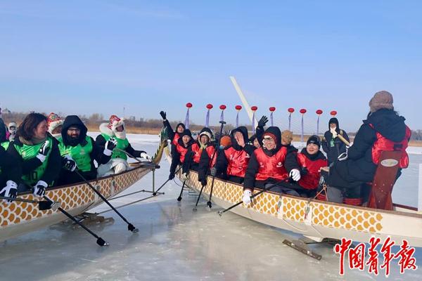 1月10日,哈尔滨,“哈工大-剑桥-牛津(哈剑牛)杯”冰上龙舟国际友谊赛开幕。来自多所高校的14支队伍参赛。比赛结束后,中国大学生和外国大学生互相招手致意。中青报·中青网记者 杨雷/摄