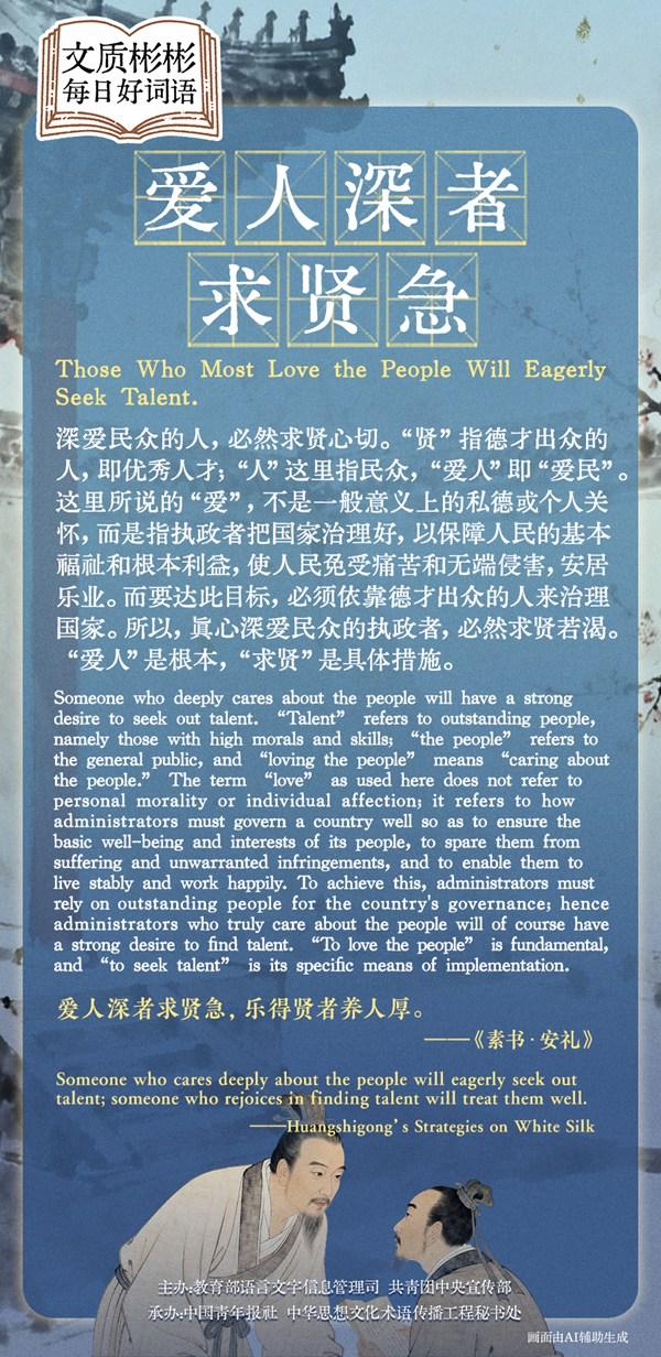 Someone who deeply cares about the people will have a strong desire to seek out talent. "Talent" refers to outstanding people, namely those with high morals and skills; "the people" refers to the general public, and "loving the people" means "caring about the people". The term "love" as used here does not refer to personal morality or individual affection; it refers to how administrators must govern a country well so as to ensure the basic well-being and interests of its people, to spare them from suffering and unwarranted infringements, and to enable them to live stably and work happily. To achieve this, administrators must rely on outstanding people for the country's governance; hence administrators who truly care about the people will of course have a strong desire to find talent. "To love the people" is fundamental, and "to seek talent" is its specific means of implementation.