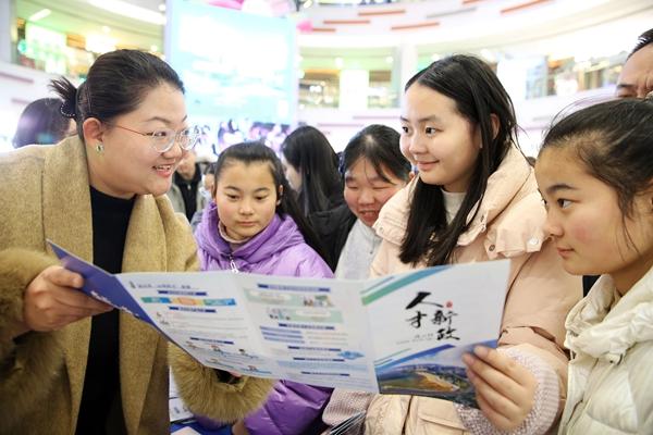 1月9日,江苏省连云港市2026年首场“人才夜市”暨“助‘就’美好前程”高校毕业生专场招聘会,一位工作人员(左)在介绍人才相关政策。视觉中国供图