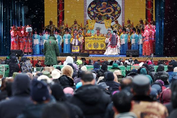秦腔演员在年货大集上演出(1月19日摄)。1月19日,甘肃省定西市安定区的年货大集在马铃薯综合交易中心开门迎客,此次年货大集将持续到腊月二十九。开集首日,现场的农特产品销售、特色美食等吸引了数万名群众前来。新华社记者 陈斌/摄