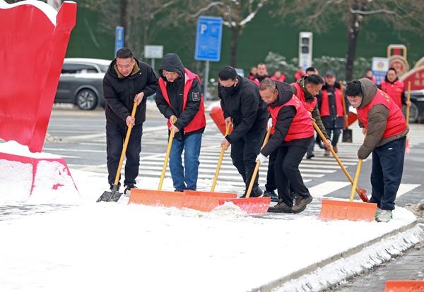 1月20日,志愿者在陕西省渭南市滨河大道清理路面积雪。近期,针对大范围降雪及降温天气,各地采取多项措施积极应对。崔正博/摄(新华社发)
