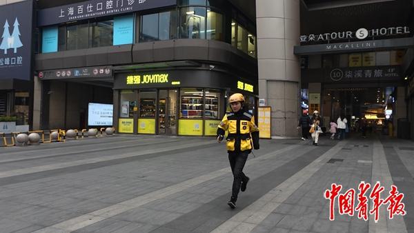 张学强跑得总是比别人快。2025年12月的一天,在上海市闵行区街头,他拎着餐食翻过台阶,跑向商场,一溜烟的工夫就不见了。