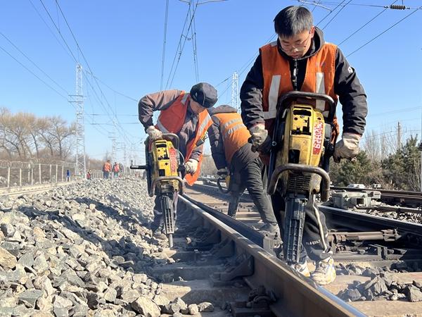 中国铁路太原局集团有限公司朔州工务段青年骨干对道岔设备进行综合维修作业。朔州工务段充分发挥青年骨干力量,近日组织各车间青年突击队对管内北同蒲、宁岢、韩原等线路设备设施进行设备质量提升工作,为冬季列车安全平稳运行提供坚实的设备保障。帖中华/摄