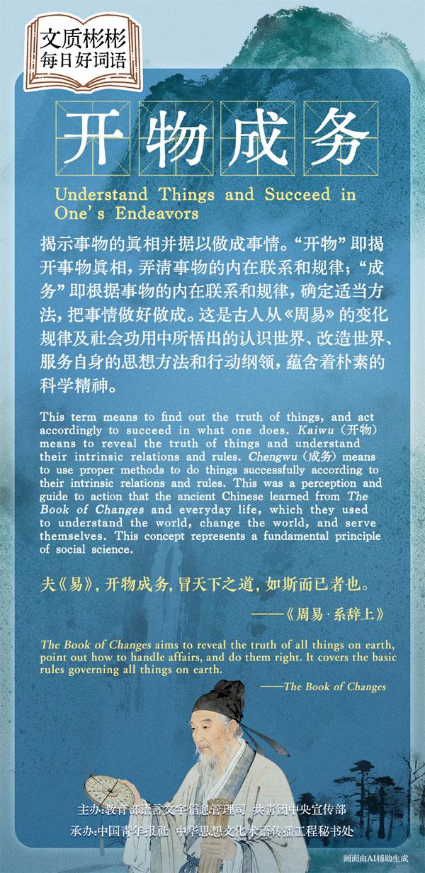 This term means to find out the truth of things, and act accordingly to succeed in what one does. Kaiwu means to reveal the truth of things and understand their intrinsic relations and rules. Chengwu means to use proper methods to do things successfully according to their intrinsic relations and rules. This was a perception and guide to action that the ancient Chinese learned from The Book of Changes and everyday life, which they used to understand the world, change the world, and serve themselves. This concept represents a fundamental principle of social science.