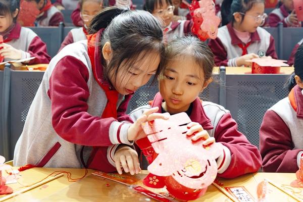 1月16日,山东济南,历城区义轩小学的学生在学习制作灯笼,迎接新春的到来。视觉中国供图