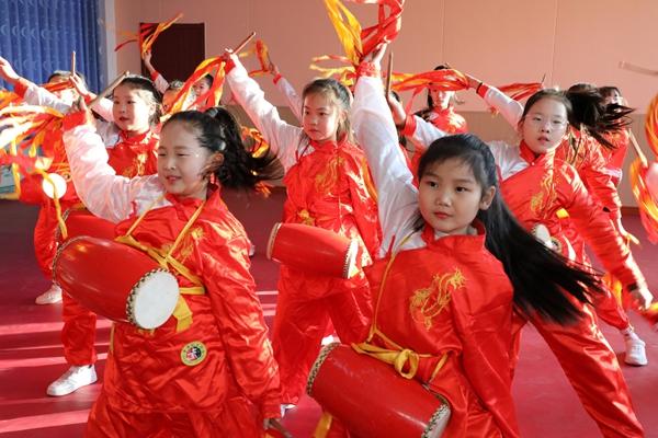 1月21日,山东滨州,博兴县第一小学学生排练传统腰鼓,载歌载舞迎接新春佳节的到来。视觉中国供图