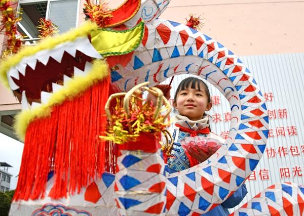 1月21日,浙江省台州市仙居县横溪镇中心小学,学生在老师指导下赶制板凳龙灯,准备热热闹闹迎新春。视觉中国供图