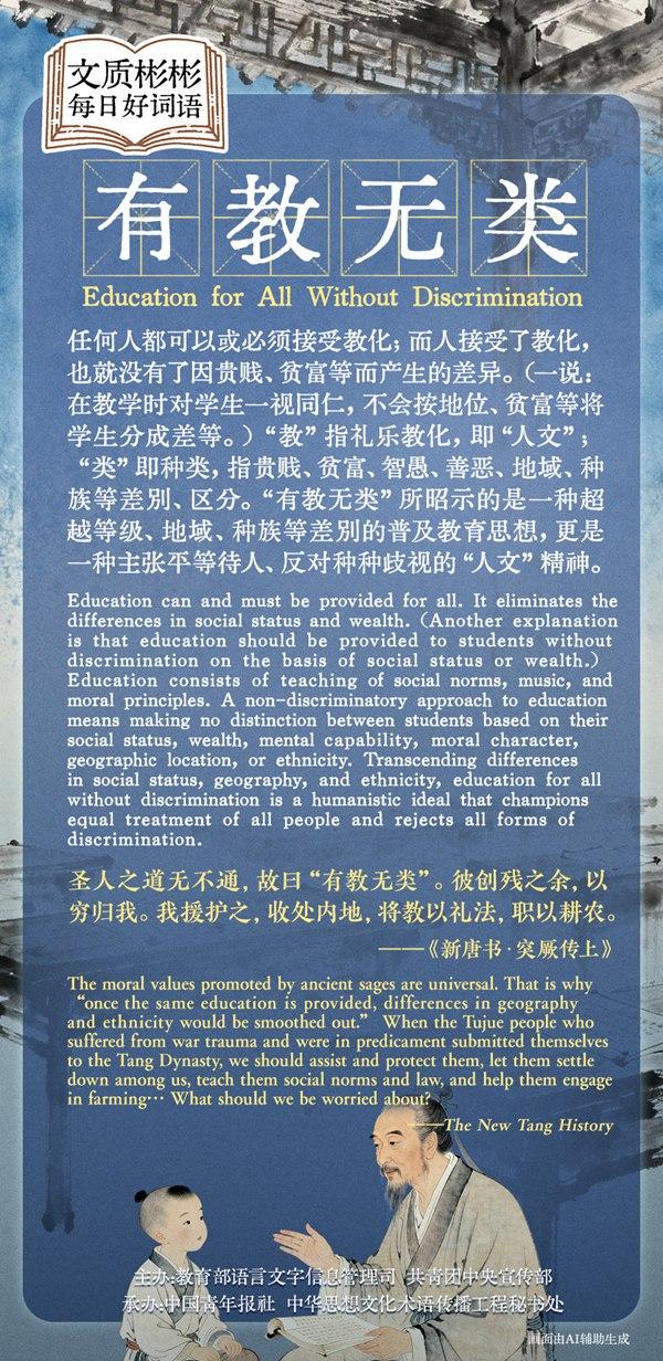 Education can and must be provided for all. It eliminates the differences in social status and wealth. (Another explanation is that education should be provided to students without discrimination on the basis of social status or wealth.) Education consists of teaching of social norms, music, and moral principles. A non-discriminatory approach to education means making no distinction between students based on their social status, wealth, mental capability, moral character, geographic location, or ethnicity. Transcending differences in social status, geography, and ethnicity, education for all without discrimination is a humanistic ideal that champions equal treatment of all people and rejects all forms of discrimination.