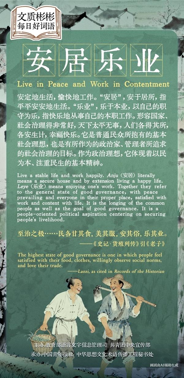 安定地生活,愉快地工作。“安居”,安于居所,指平平安安地生活。“乐业”,乐于本业,以自己的职守为乐,指快乐地从事自己的本职工作。形容国家、社会治理得非常好,天下太平无事,人们各得其所,各安生计,幸福快乐。它是普通民众所抱有的基本社会理想,也是有所作为的政治家、管理者所追求的社会治理的目标。作为政治理想,它体现着以民为本、注重民生的基本精神。