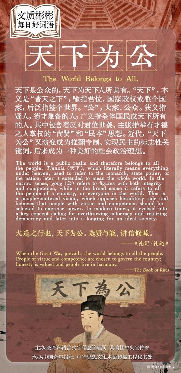The world is a public realm and therefore belongs to all the people. Tianxia, which literally means everything under heaven, used to refer to the monarch, state power, or the nation; later it extended to mean the whole world. In the narrow sense, gong refers to figures with both integrity and competence, while in the broad sense it refers to all the people of a country, or everyone in the world. This is a people-centered vision, which opposes hereditary rule and believes that people with virtue and competence should be selected to exercise power. In modern times, it evolved into a key concept calling for overthrowing autocracy and realizing democracy and later into a longing for an ideal society.