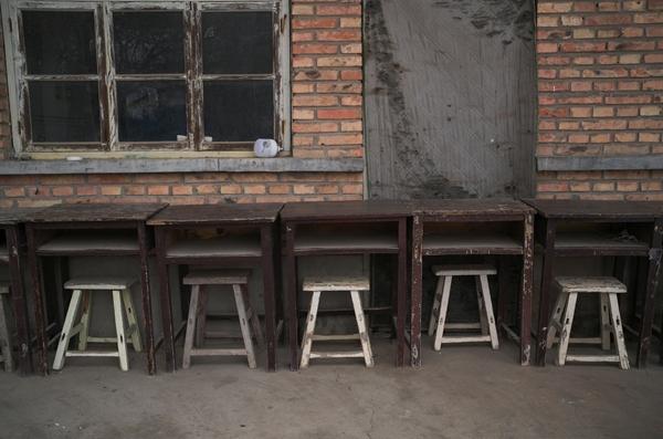 这座由村里闲置废旧厂房改造而成的摔跤武馆,没有精致的装潢,只有一间简易的训练馆和一片开阔的荒野空地。空地上整齐地摆放着杠铃、花砖、水缸、石锁等训练器材,一旁还有一排旧课桌。目前在这里学习的37个孩子,年纪最小的5岁,最大的18岁,大都还在上学。孩子们周一至周五放学后在旧课桌上写完作业,再一起练上约莫两小时。周末则是上午练体能和力量,下午学习摔跤技巧。推花砖、举杠铃、甩石锁、蛙跳、鸭子步……寒冬中,孩子们攥紧拳头,跟着口号的节奏咬牙坚持,脸蛋冻得通红,眼神却亮得像星星。