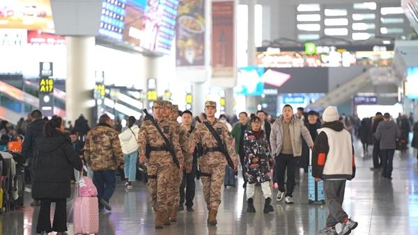 2月2日,2026年春运正式开启。武警四川总队提前对接川内各大机场、高铁站等交通枢纽,会同多部门分析研判形势,动态调整兵力部署,守护旅客顺利返乡。图为武警成都支队官兵在成都东站候车大厅巡逻执勤,护航旅客平安出行。向前/摄