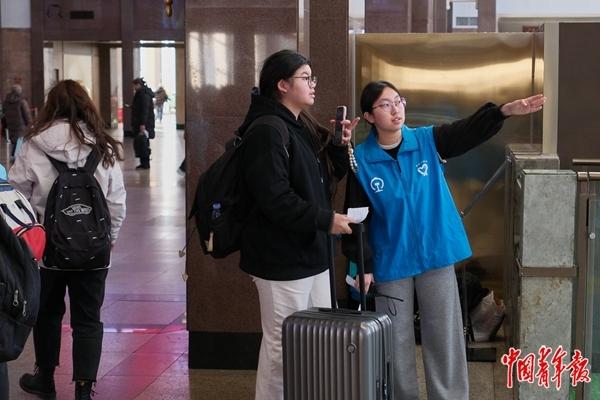 2月7日,一名青年志愿者在北京站二层电梯口为旅客指路。据了解,2026年春运“暖冬行动”已全面启动,春运志愿者身着“志愿蓝”马甲,在全国527个客运车站、7014个志愿服务点为春运旅客提供进站引导、候车帮扶、检票协助等服务,为亿万旅客平安有序出行注入青春暖流。中青报·中青网记者 田嘉硕/摄