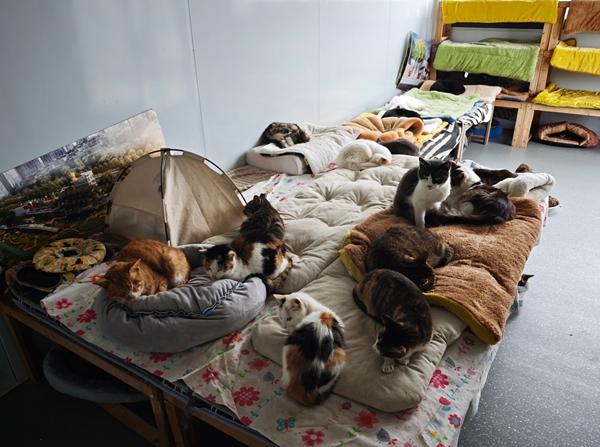 萤火虫港湾在建设期间,由于资金、场地手续等问题,曾停工过很长时间,但流浪猫已经陆续住了进来。成员只好在荒地上一起搭雨棚、铺稻草,陪十几只流浪猫度过了第一个冬天。