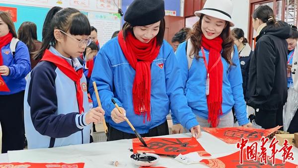 2月9日,柳州市鱼峰山小学,越南青年代表和中国小学生共同书写福字,感受中国年味。中青报·中青网记者 谢洋/摄