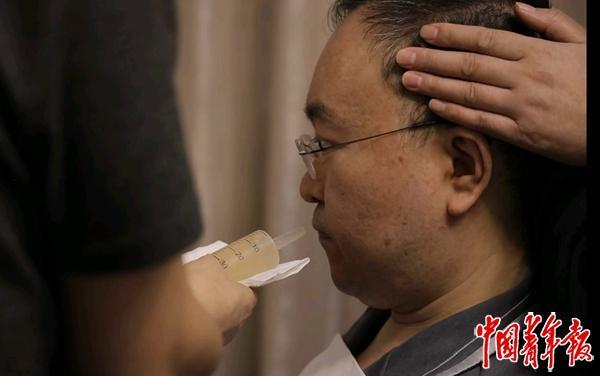 每两小时,蔡磊就需要由4位护工将他“搬”回床上休息。躺下后,他的呼吸完全依赖一根插入鼻腔的塑料管路——一台代替他已经瘫痪的呼吸肌工作的呼吸机。等待“上机”的几十秒,他脸上浮现出极度痛苦的面容。