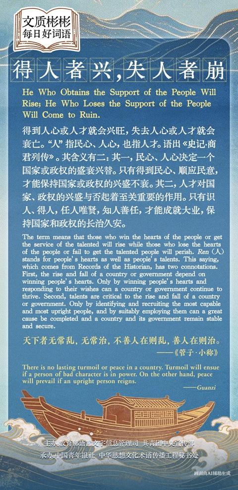 The term means that those who win the hearts of the people or get the service of the talented will rise while those who lose the hearts of the people or fail to get the talented people will perish. Ren stands for people's hearts as well as people's talents. This saying, which comes from Records of the Historian, has two connotations. First, the rise and fall of a country or government depend on winning people's hearts. Only by winning people's hearts and responding to their wishes can a country or government continue to thrive. Second, talents are critical to the rise and fall of a country or government. Only by identifying and recruiting the most capable and most upright people, and by suitably employing them can a great cause be completed and a country and its government remain stable and secure.
