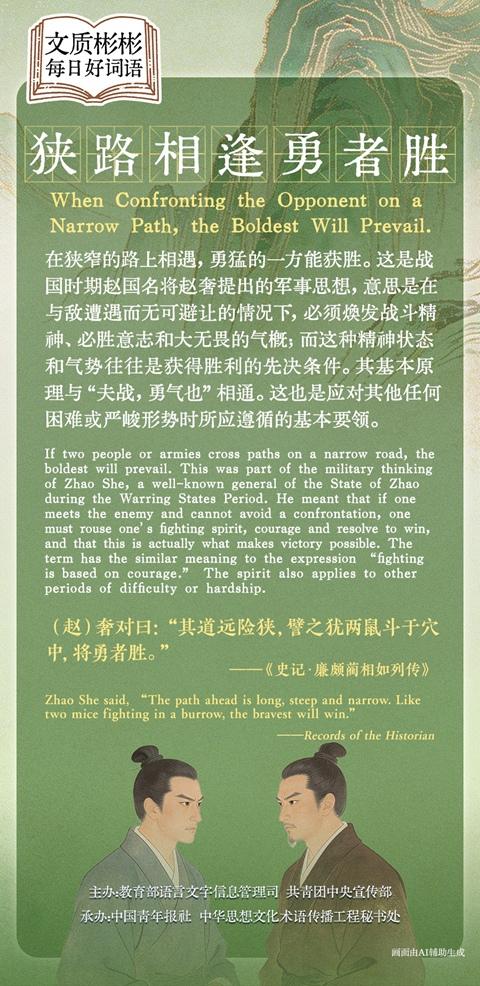 If two people or armies cross paths on a narrow road, the boldest will prevail. This was part of the military thinking of Zhao She, a well-known general of the State of Zhao during the Warring States Period. He meant that if one meets the enemy and cannot avoid a confrontation, one must rouse one's fighting spirit, courage and resolve to win, and that this is actually what makes victory possible. The term has the similar meaning to the expression "fighting is based on courage." The spirit also applies to other periods of difficulty or hardship.