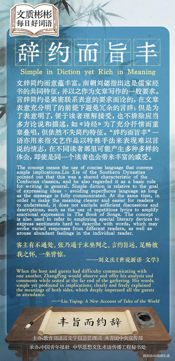 The concept means the use of concise language that conveys ample implications. Liu Xie of the Southern Dynasties pointed out that this was a shared characteristic of the Confucian classics, and he also regarded it as a basic rule for writing in general. Simple diction is relative to the goal of expressing ideas-avoiding superfluous language as long as the message is fully communicated. At the same time, in order to make the meaning clearer and easier for readers to understand, it does not exclude sufficient discussions and descriptions, such as the use of repetitious lyrics to amplify emotional expression in The Book of Songs. The concept is also used to refer to employing special literary devices to express sentiments hard to describe with words, which may evoke varied responses from different readers, as well as arouse abundant feelings in the individual reader.