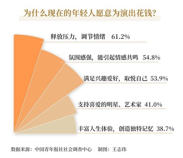 年轻人为什么愿意为演出花钱?调查显示,61.2%的受访青年认为是出于释放压力、调节情绪的目的;54.8%的受访青年认为是现场氛围感强,能引起情感共鸣;53.9%的受访青年表示是为了满足自己的兴趣爱好,取悦自己;41.0%的受访青年觉得是为了支持喜爱的明星、艺术家。其他还有:丰富人生体验,创造独特记忆(38.7%);能在现场找到同好,拓展社交圈(32.9%);能与明星、艺术家近距离互动(28.8%);门票价格在承受范围内,消费得起(24.1%)。