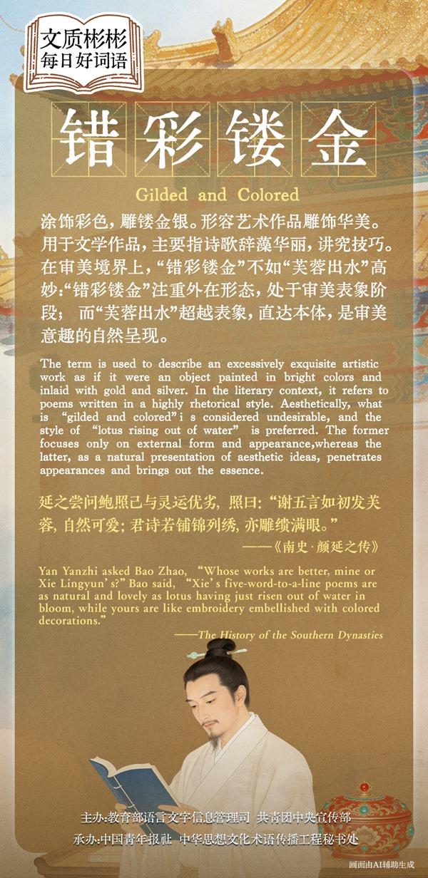 The term is used to describe an excessively exquisite artistic work as if it were an object painted in bright colors and inlaid with gold and silver. In the literary context, it refers to poems written in a highly rhetorical style. Aesthetically, what is“gilded and colored”is considered undesirable, and the style of“lotus rising out of water”is preferred. The former focuses only on external form and appearance, whereas the latter, as a natural presentation of aesthetic ideas, penetrates appearances and brings out the essence.