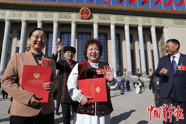 3月11日上午,北京人民大会堂外,全国政协十四届四次会议闭幕会结束后,几位委员手捧会议手册合影留念。当日,全国政协十四届四次会议在圆满完成各项议程后闭幕。中青报·中青网记者 陈剑/摄