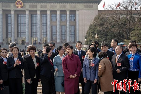 3月12日,北京,人民大会堂外,十四届全国人大四次会议闭幕会开始前,代表们在广场上准备合影留念。当日,十四届全国人大四次会议在圆满完成各项议程后闭幕。中青报·中青网记者 李隽辉/摄