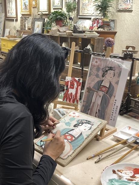 察觉到这个变化,朱俊峰在教学之外,开始把更多心思放在软装上。今年,他在店门口复刻了一个洞窟,推门进去,仿佛踏入另一个时空。店慢慢有了“网红店”的气质。一些网络博主陆续来打卡,她们的几篇笔记发出后,店一下子就火了。不少穿着精致的客人随之而来,打卡拍照,体验一把“自己是敦煌壁画师”的感觉。