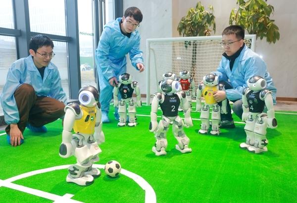 3月16日,湖北光谷盛创技术人员对机器人足球竞技对抗系统进行调试。