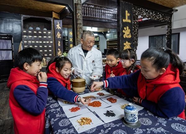 3月17日,在江苏省兴化市昭阳街道上池斋药店,兴化市景范学校学生在中药师的指导下学习中草药知识。当日是中国国医节,各地开展体验中医药文化主题活动。周社根/摄(新华社发)